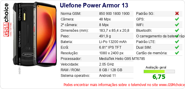 Dados sobre o telemóvel Ulefone Power Armor 13 na sua página
