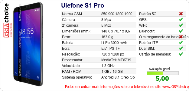 Dados sobre o telemóvel Ulefone S1 Pro na sua página