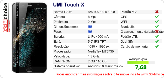 Dados sobre o telemóvel UMI Touch X na sua página