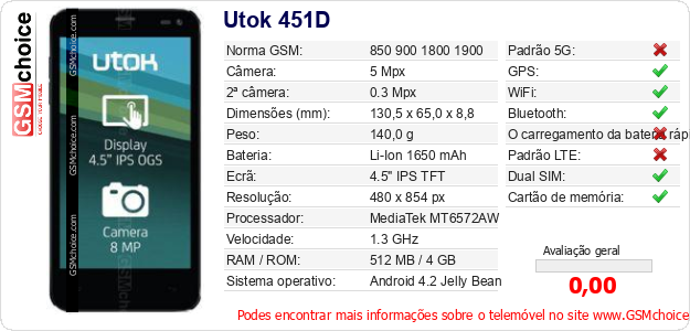 Dados sobre o telemóvel Utok 451D na sua página