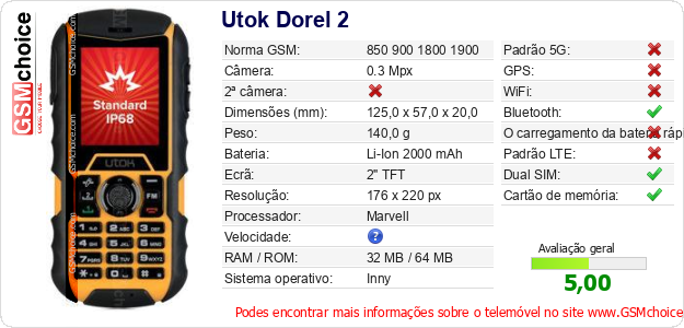 Dados sobre o telemóvel Utok Dorel 2 na sua página