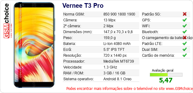 Dados sobre o telemóvel Vernee T3 Pro na sua página