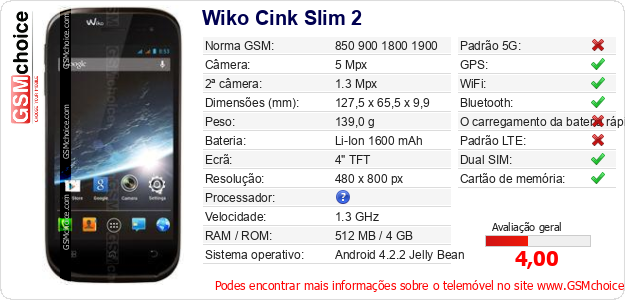 Dados sobre o telemóvel Wiko Cink Slim 2 na sua página