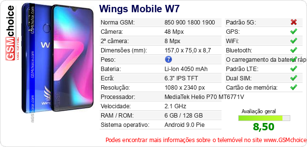Dados sobre o telemóvel Wings Mobile W7 na sua página