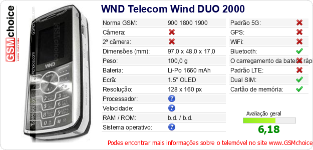 Dados sobre o telemóvel WND Telecom Wind DUO 2000 na sua página