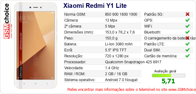 Dados sobre o telemóvel Xiaomi Redmi Y1 Lite na sua página