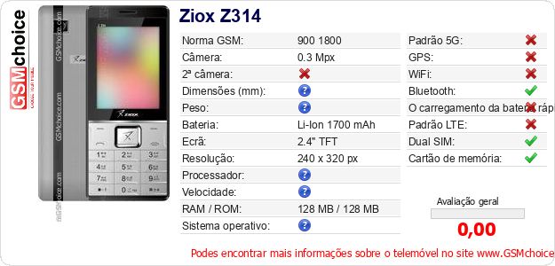 Dados sobre o telemóvel Ziox Z314 na sua página