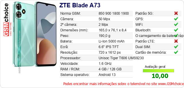 Dados sobre o telemóvel ZTE Blade A73 na sua página
