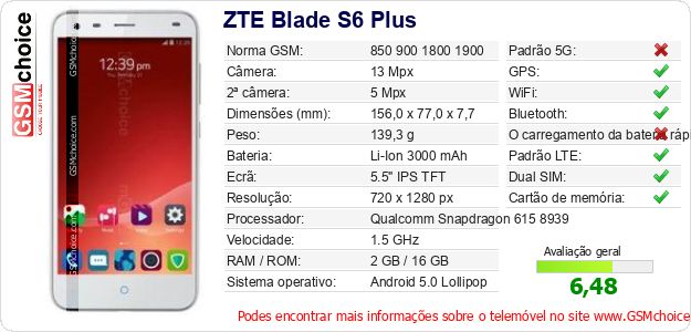 Dados sobre o telemóvel ZTE Blade S6 Plus na sua página
