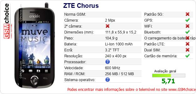 Dados sobre o telemóvel ZTE Chorus na sua página