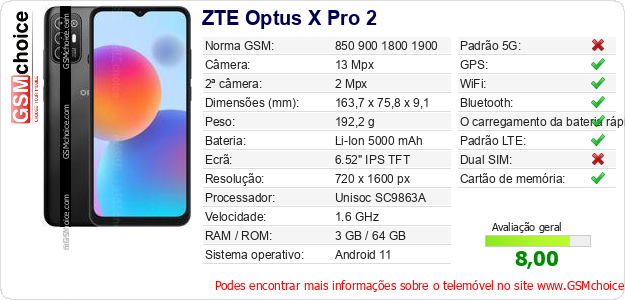 Dados sobre o telemóvel ZTE Optus X Pro 2 na sua página