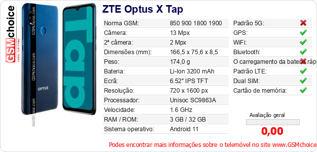 Dados sobre o telemóvel ZTE Optus X Tap na sua página