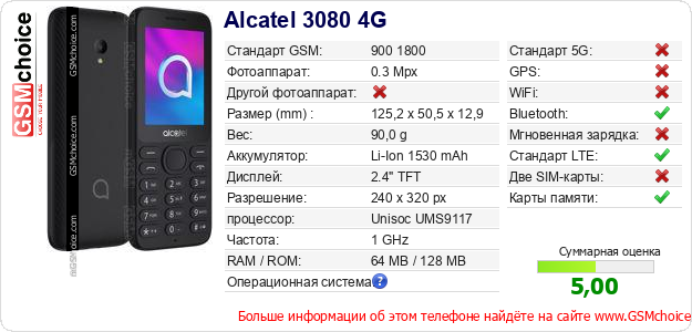 Данные о телефоне Alcatel 3080 4G на Вашем сайте
