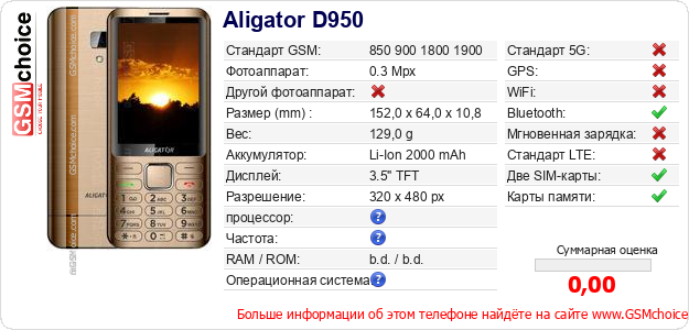 У Тебя есть свой сайт? Хочешь где-то разместить информацию о базовых данных мобильника Aligator D950 ? Это запросто устроить. Достаточно скачать картинку или скопировать и разместить на соответствующем сайте нижерасположенный код:Размещение этого кода вызовет появление нижерасположенной картинки: