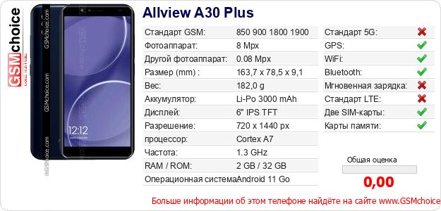 Данные о телефоне Allview A30 Plus на Вашем сайте