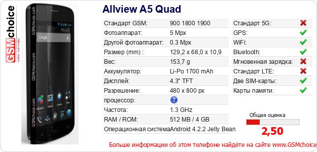 Данные о телефоне Allview A5 Quad на Вашем сайте