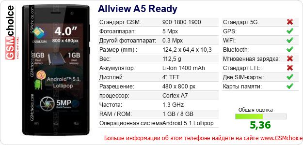 Данные о телефоне Allview A5 Ready на Вашем сайте