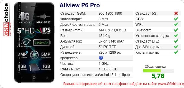 Данные о телефоне Allview P6 Pro на Вашем сайте