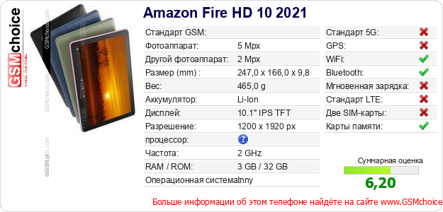 Данные о телефоне Amazon Fire HD 10 2021 на Вашем сайте