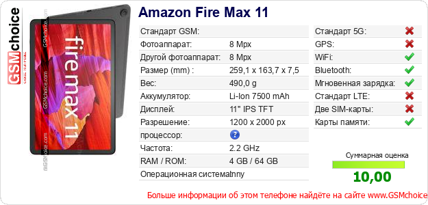 Данные о телефоне Amazon Fire Max 11 на Вашем сайте