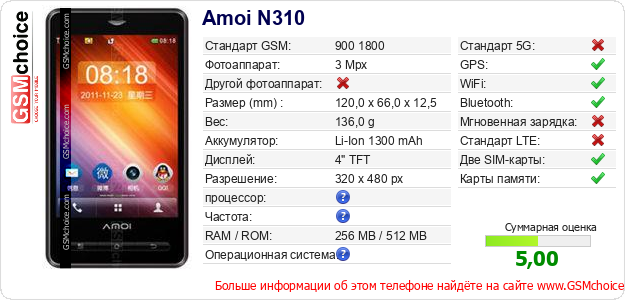У Тебя есть свой сайт? Хочешь где-то разместить информацию о базовых данных мобильника Amoi N310 ? Это запросто устроить. Достаточно скачать картинку или скопировать и разместить на соответствующем сайте нижерасположенный код:Размещение этого кода вызовет появление нижерасположенной картинки: