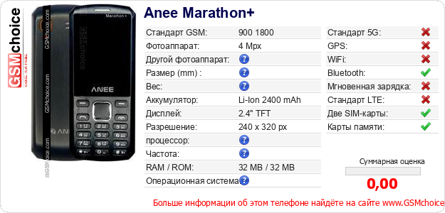 Данные о телефоне Anee Marathon+ на Вашем сайте