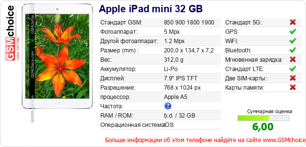 Данные о телефоне Apple iPad mini 32 GB на Вашем сайте