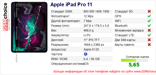 Данные о телефоне Apple iPad Pro 11 на Вашем сайте