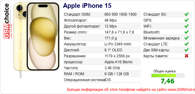 У Тебя есть свой сайт? Хочешь где-то разместить информацию о базовых данных мобильника Apple iPhone 15 ? Это запросто устроить. Достаточно скачать картинку или скопировать и разместить на соответствующем сайте нижерасположенный код:Размещение этого кода вызовет появление нижерасположенной картинки: