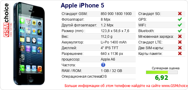 Данные о телефоне Apple iPhone 5 на Вашем сайте