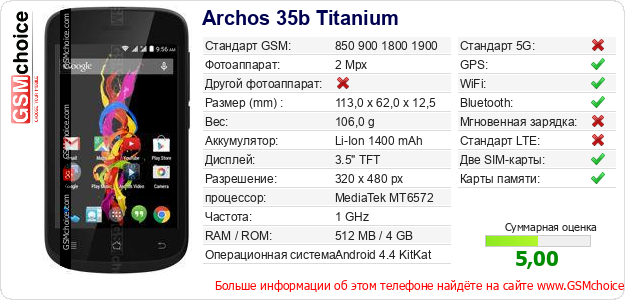 Данные о телефоне Archos 35b Titanium на Вашем сайте