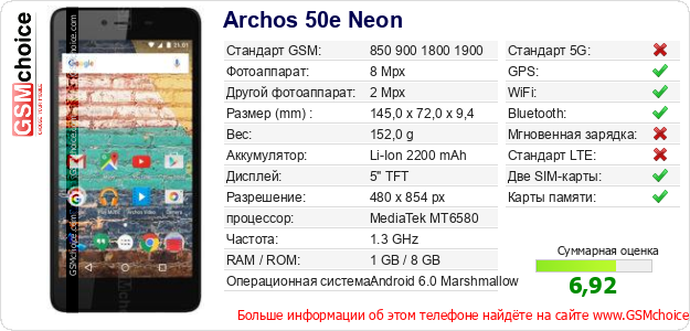 Данные о телефоне Archos 50e Neon на Вашем сайте