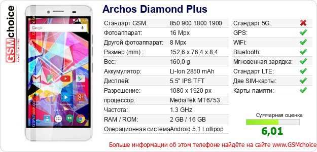 Данные о телефоне Archos Diamond Plus на Вашем сайте
