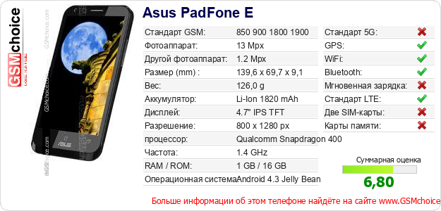 Данные о телефоне Asus PadFone E на Вашем сайте