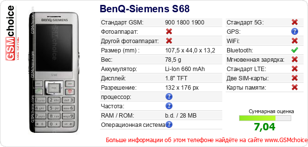 Данные о телефоне BenQ-Siemens S68 на Вашем сайте