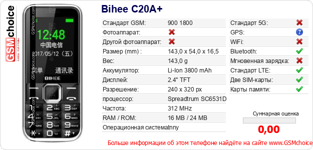Данные о телефоне Bihee C20A+ на Вашем сайте