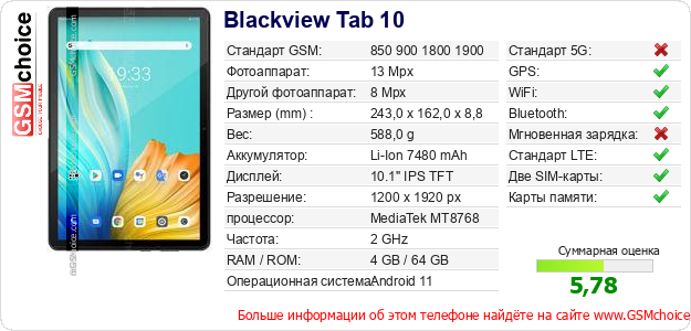 Данные о телефоне Blackview Tab 10 на Вашем сайте