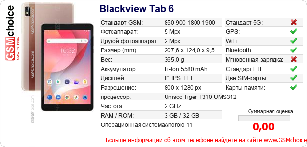 Данные о телефоне Blackview Tab 6 на Вашем сайте