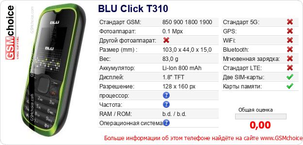 Данные о телефоне BLU Click T310 на Вашем сайте