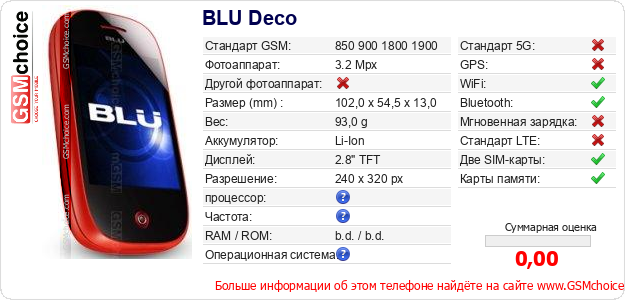 У Тебя есть свой сайт? Хочешь где-то разместить информацию о базовых данных мобильника BLU Deco ? Это запросто устроить. Достаточно скачать картинку или скопировать и разместить на соответствующем сайте нижерасположенный код:Размещение этого кода вызовет появление нижерасположенной картинки: