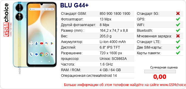 У Тебя есть свой сайт? Хочешь где-то разместить информацию о базовых данных мобильника BLU G44+ ? Это запросто устроить. Достаточно скачать картинку или скопировать и разместить на соответствующем сайте нижерасположенный код:Размещение этого кода вызовет появление нижерасположенной картинки: