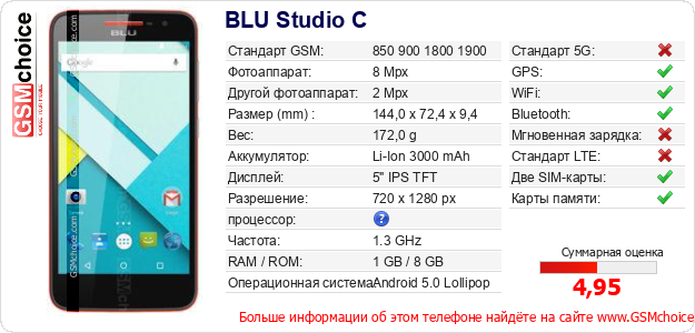 У Тебя есть свой сайт? Хочешь где-то разместить информацию о базовых данных мобильника BLU Studio C ? Это запросто устроить. Достаточно скачать картинку или скопировать и разместить на соответствующем сайте нижерасположенный код:Размещение этого кода вызовет появление нижерасположенной картинки: