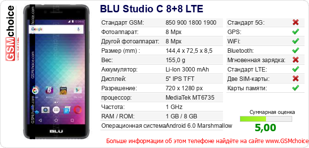 Данные о телефоне BLU Studio C 8+8 LTE на Вашем сайте