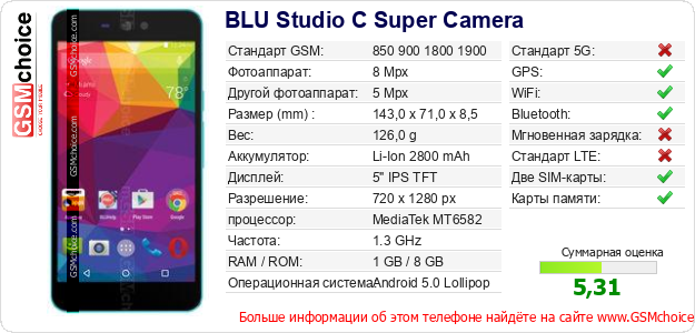 Данные о телефоне BLU Studio C Super Camera на Вашем сайте
