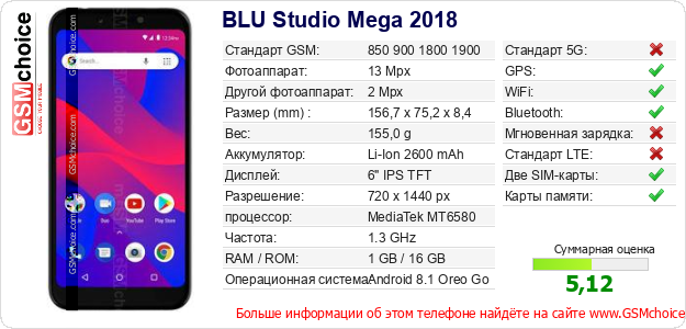 Данные о телефоне BLU Studio Mega 2018 на Вашем сайте