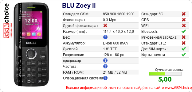 У Тебя есть свой сайт? Хочешь где-то разместить информацию о базовых данных мобильника BLU Zoey II ? Это запросто устроить. Достаточно скачать картинку или скопировать и разместить на соответствующем сайте нижерасположенный код:Размещение этого кода вызовет появление нижерасположенной картинки: