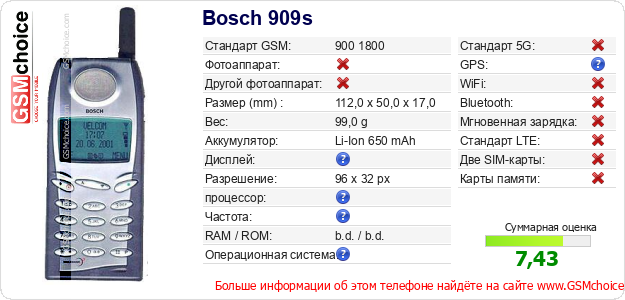 У Тебя есть свой сайт? Хочешь где-то разместить информацию о базовых данных мобильника Bosch 909s ? Это запросто устроить. Достаточно скачать картинку или скопировать и разместить на соответствующем сайте нижерасположенный код:Размещение этого кода вызовет появление нижерасположенной картинки: