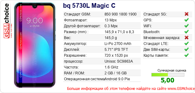 Данные о телефоне bq 5730L Magic C на Вашем сайте