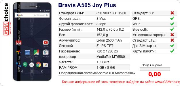 Данные о телефоне Bravis A505 Joy Plus на Вашем сайте