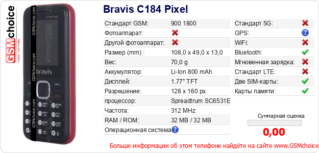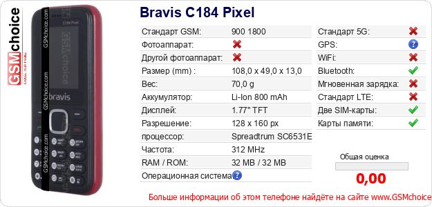 У Тебя есть свой сайт? Хочешь где-то разместить информацию о базовых данных мобильника Bravis C184 Pixel ? Это запросто устроить. Достаточно скачать картинку или скопировать и разместить на соответствующем сайте нижерасположенный код:Размещение этого кода вызовет появление нижерасположенной картинки: